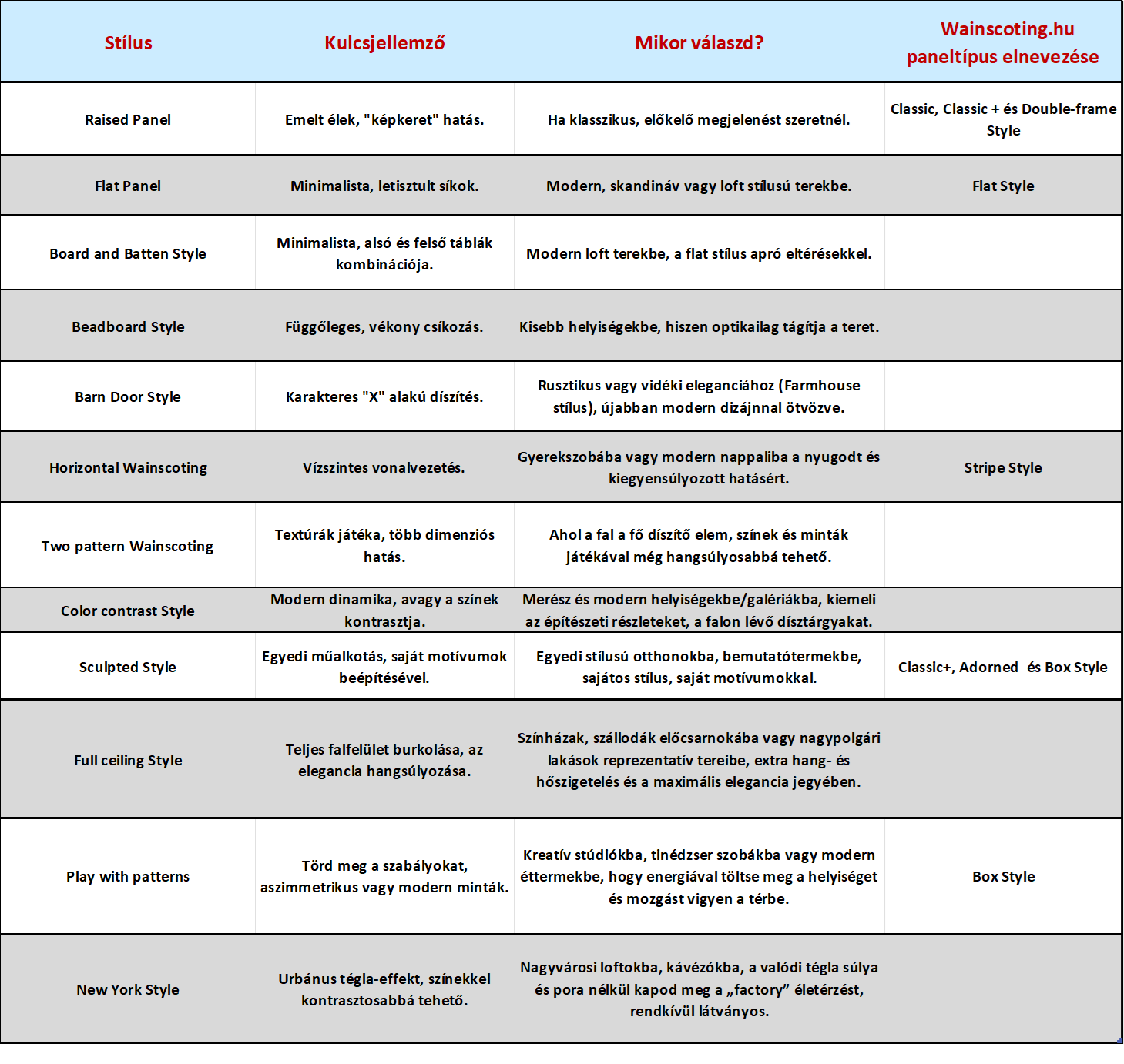 A falipanelek típusai